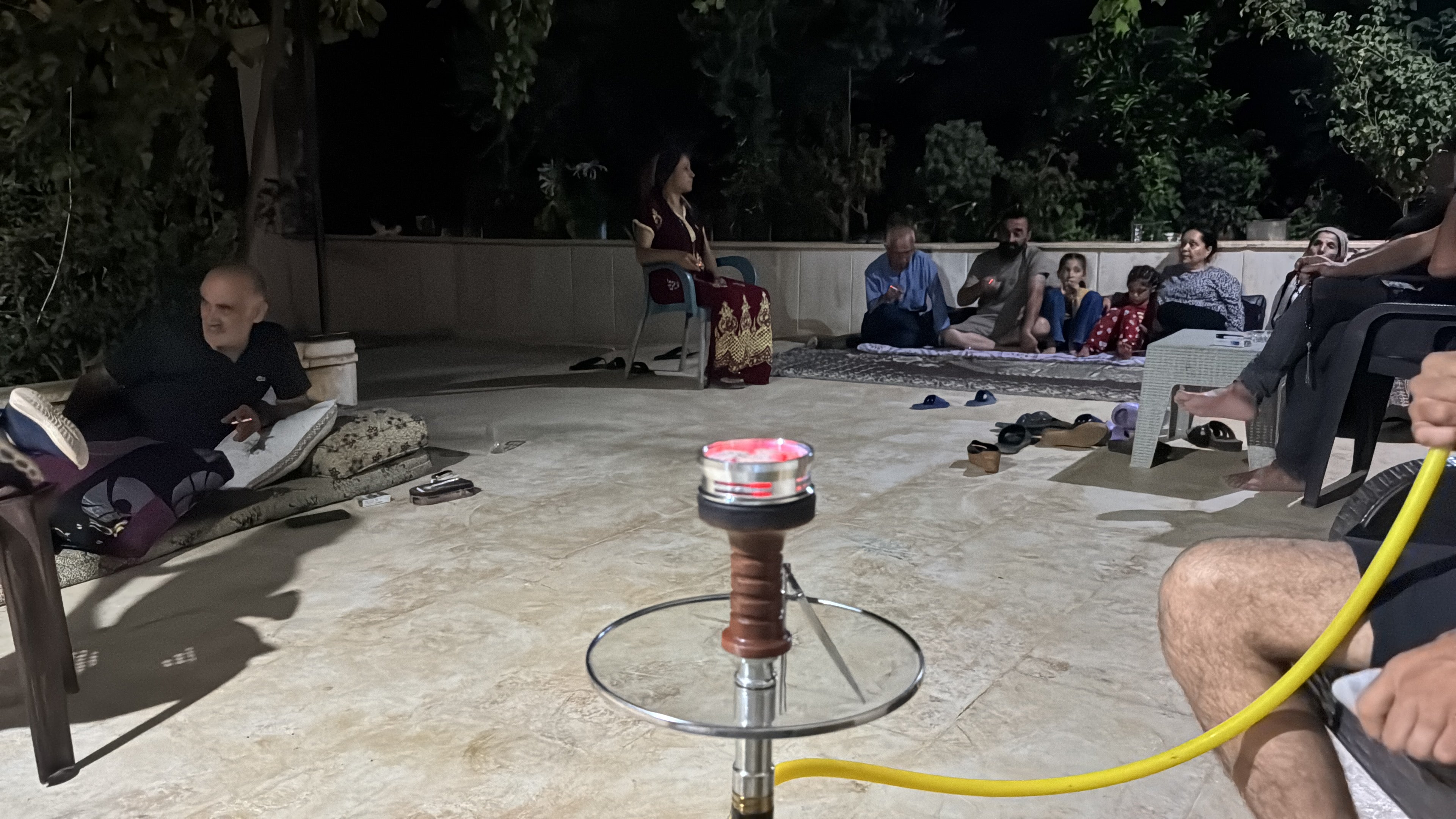 's Avonds komt het huis tot leven. Gasten arriveren, baklava wordt in royale porties geserveerd en de lucht vult zich met de geur van koffie, thee en de zoete rook van de waterpijp. Jong en oud verzamelen zich en zitten naast elkaar op kussens die verspreid liggen over de pas aangeveegde binnenplaats. Overdag is het door de hitte bijna onmogelijk om buiten te zijn, maar als de avond valt, koelt de lucht af en ontstaan de beste gesprekken. Dan blijft het gelach hangen, worden verhalen gedeeld en begint de ware essentie van de dag.