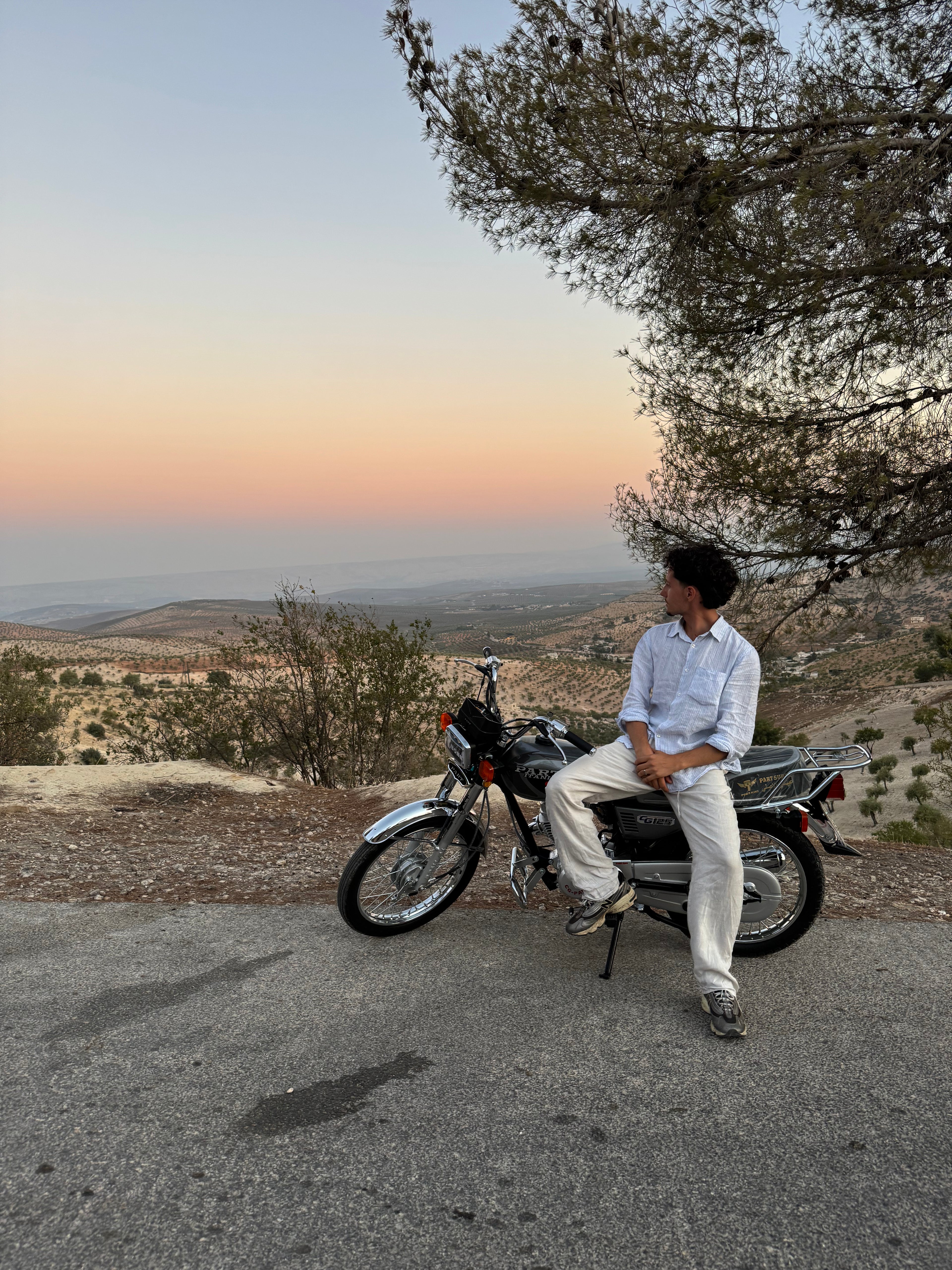 Mijn vader zei altijd dat het eerste wat hij zou doen als hij terugkeerde naar Syrië, een ritje op zijn motor zou zijn. Volgens Nederlandse maatstaven is dit een heel simpele 125cc-motor. Maar elke Syriër of Koerd kent deze motoren, motoren waarop soms gezinnen van zes personen rijden, motoren waarop je zonder helm, zonder bescherming, rijdt. En natuurlijk moest ik dat ook doen. We reden naar Kafr Dalī bij Taḩtānī. Het uitzicht was ongelooflijk.