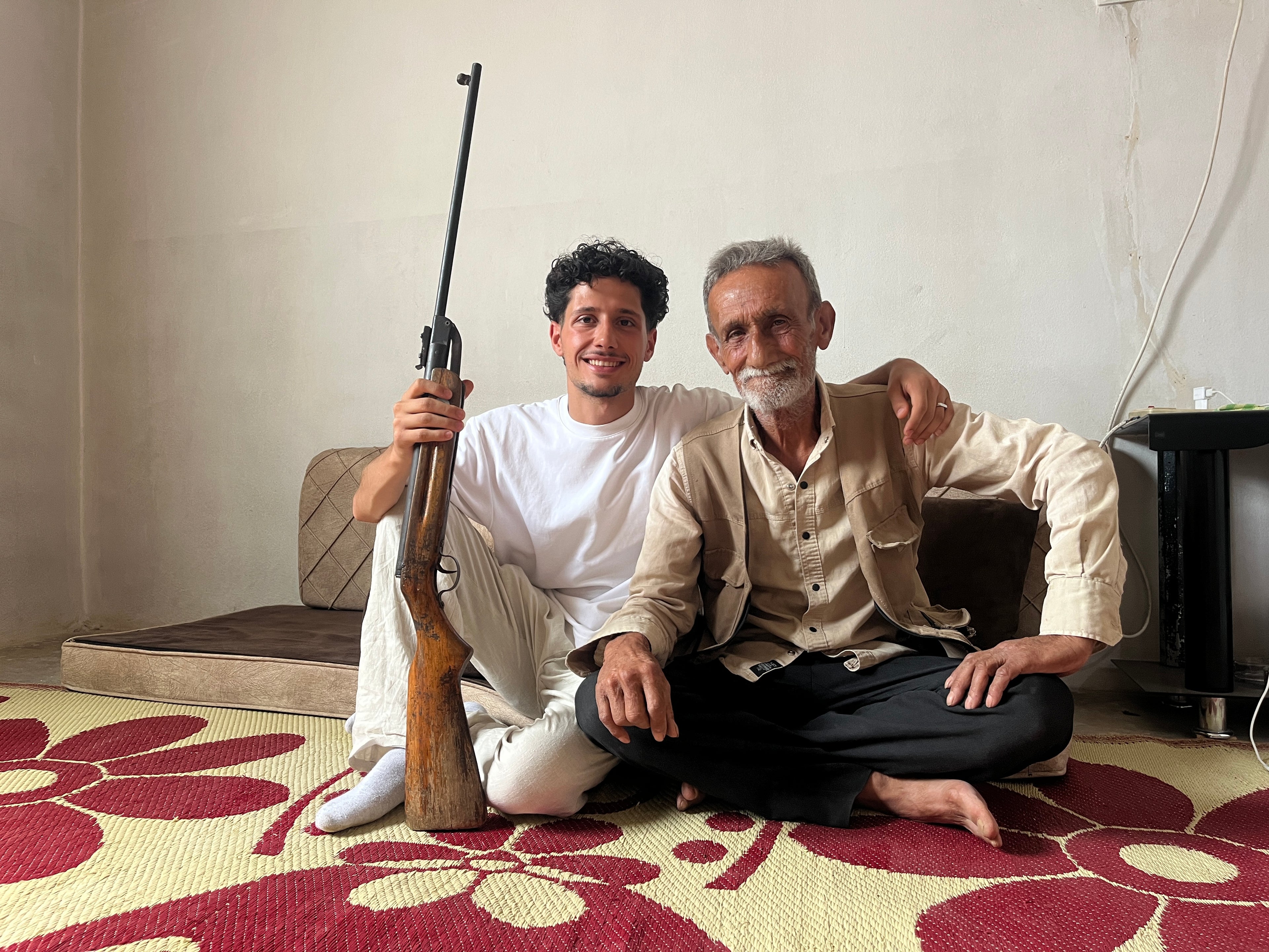 Zoals ik al eerder zei, heb ik alle familieleden die je hier ziet voor het eerst in Syrië ontmoet. Deze man, mijn oom, de broer van mijn vader, is daarop geen uitzondering. Hij houdt van jagen en rookt, zoals de meeste Syriërs, veel sigaretten. Zijn vrouw en kinderen waren naar de dokter in Aleppo (ongeveer een uur rijden). We zaten er nog geen vijf minuten toen hij meteen aan mijn zus (die hij ook voor het eerst ontmoette) vroeg of ze koffie voor ons kon zetten. Mijn tante, moeder, nicht en ik moesten hard lachen, want waar in Nederland zou je je bezoekers ooit vragen of ze koffie voor je kunnen zetten? In Syrië lijkt het heel normaal.